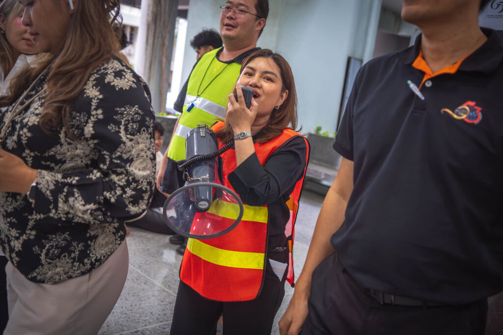 On Monday, November 17, 2025, the Energy, Environment, Safety and Health (EESH) Center at King Mongkut’s University of Technology Thonburi (KMUTT) conducted its Annual Fire Evacuation Drill for Building Zone 8. This zone includes the Classroom Building 3 (S13) and the King Mongkut’s 190th Anniversary Memorial Building (S14).